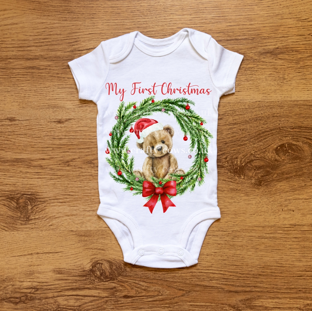 Transform your baby's wardrobe this holiday season with the adorable First Christmas Bear Wreath DTF transfer. Keep your little one festive and cozy in style!