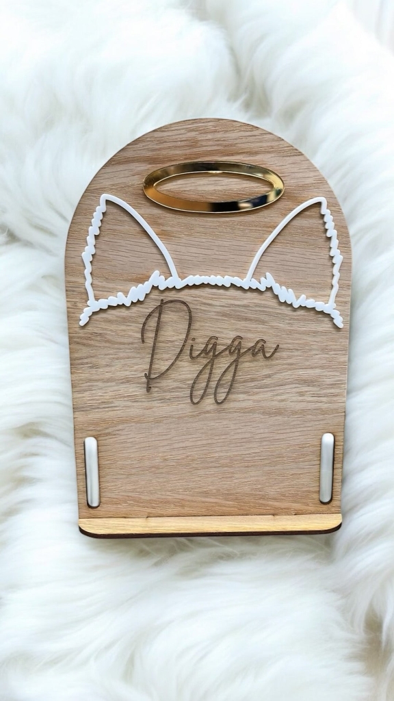 Honour the memory of your beloved canine companion with our Freestanding Dog Memorial Collar Holder. Crafted from high-quality 4mm oak veneer, this elegant memorial piece can be customized with your pet's name and dates, creating a heartfelt tribute that celebrates their life and spirit. The natural beauty of the oak veneer is complemented by a stunning gold halo and dog ears in your selected colour, adding a touch of warmth and sophistication to any space. Perfect for displaying your dog's collar, this memorial holder serves as a beautiful reminder of the joy and love your furry friend brought into your life.