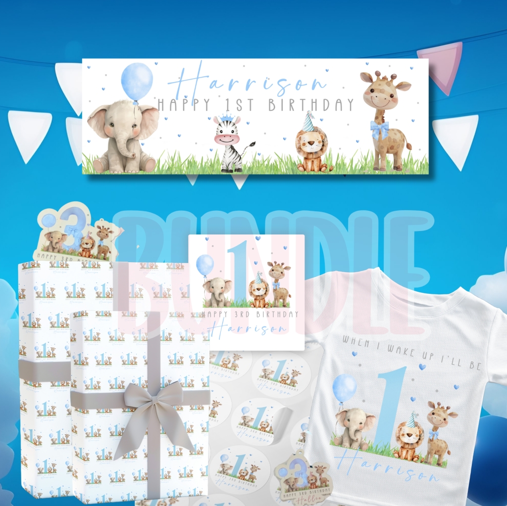 Celebrate your little one's special day with our Personalized Blue Safari Birthday Bundle! This delightful set is designed to create a memorable safari-themed birthday party that your child will cherish forever. This birthday bundle not only adds a fun and vibrant touch to your celebration but also allows you to incorporate your child's name and age for a personal touch. Transform your party into an unforgettable jungle adventure with this charming and unique birthday bundle!