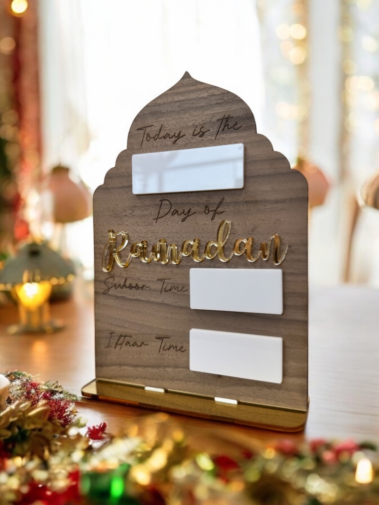 Days of Ramadan Board, made from 4mm Walnut Veneer and Gold embellishments with a white Acrylic to use with wipeable pens!Freestanding with base included
