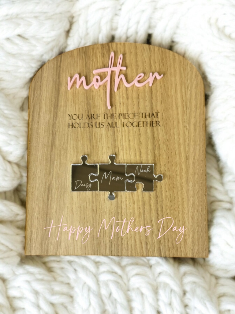 Mothers Day Oak Jigsaw Board with 3 jigsaw pieces in Silver mirror.