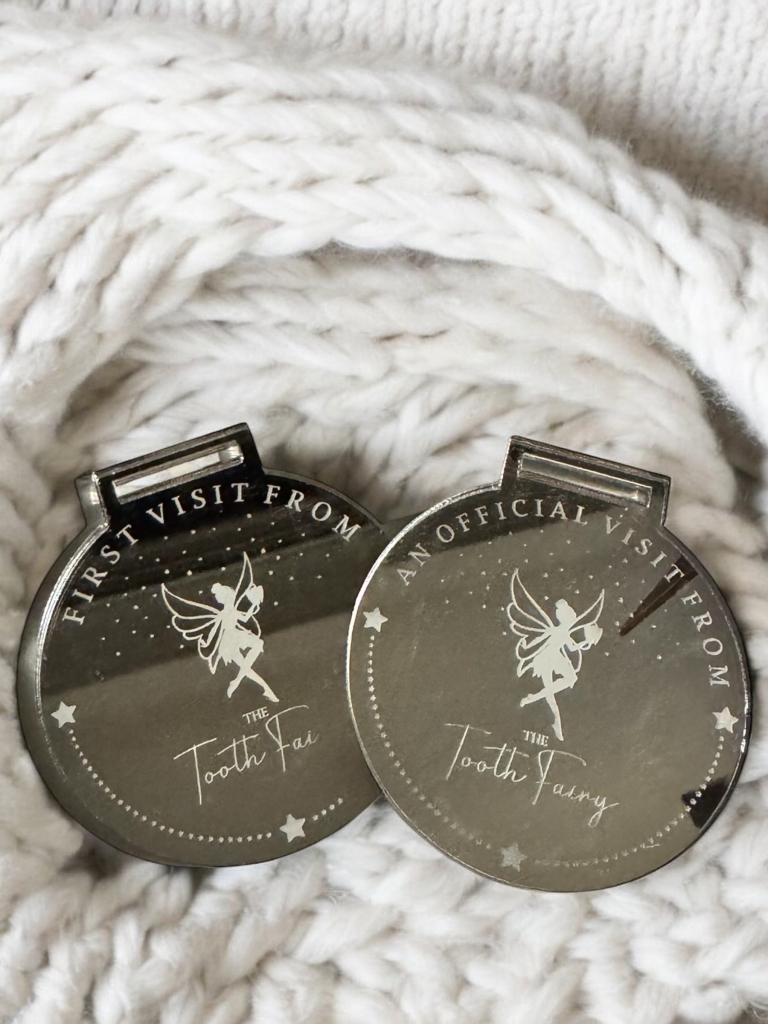 Experience the magic of your child's first lost tooth with our Tooth Fairy Medal! The perfect way to commemorate this exciting milestone and create lasting memories. Choose from two delightful options: 'First Visit from The Tooth Fairy' or 'An Official Visit from The Tooth Fairy'. Made from high-quality Silver Mirror XT 3mm Acrylic, this medal is a shimmering reminder of the enchanting visit from the Tooth Fairy. A one-of-a-kind keepsake that your child will cherish forever. Make their Tooth Fairy visit even more special with our unique medal!