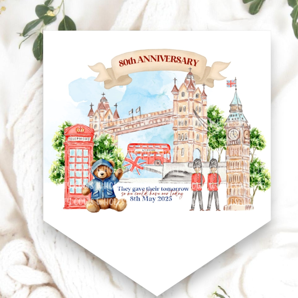 PVC Eco Solvent Printed Pennant, with a space for personalisation, comes with 2 hanging holes so ready to hang 175mm x 150mm Celebrate VE Day in style with this pennant!