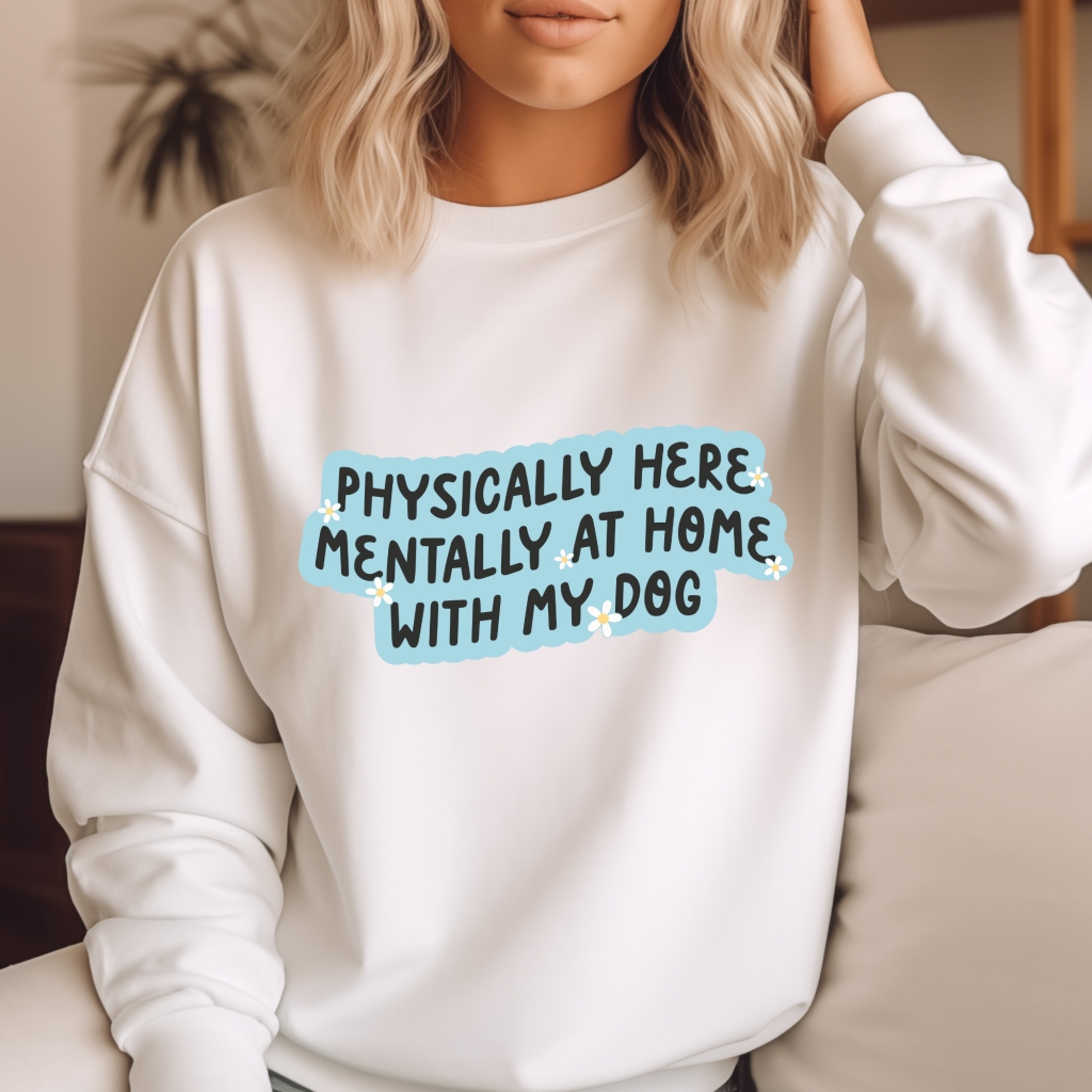 Take your love for your furry friend to the next level with our Physically Here Mentally with my Dog DTF transfer print. Enjoy showing off your pet's unique personality and your strong bond with them through stylish and comfortable clothing. Feel connected to your dog wherever you go, mentally and physically!