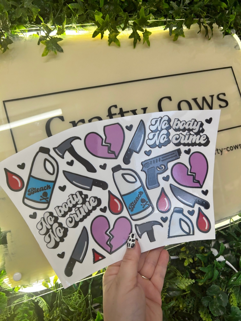 Get creative with your cold cups and add a touch of humor to your daily routine! With a sleek and vibrant design, you'll be the talk of the town and bring a darkly humorous twist to your on-the-go beverages. Show off your unique style and spread some laughter wherever you go with our No Body No Crime decals.